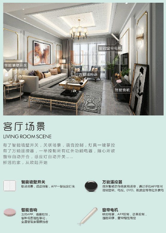 疲惫的夜晚回到家,本是孤寂摸黑一片,装了智能家居,一开门,就能看到明亮的灯光瞬间开启,自动为你关闭的窗帘,冷气不再入侵;慵懒的瘫在沙发上,打开手机APP,打开智能音响,随即为你挑选最应景的治愈的歌。